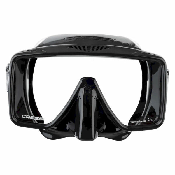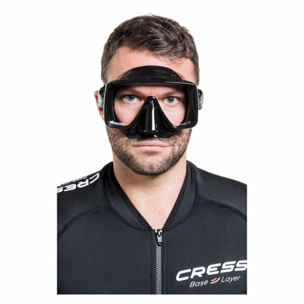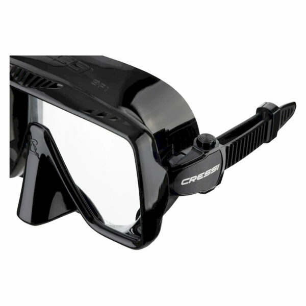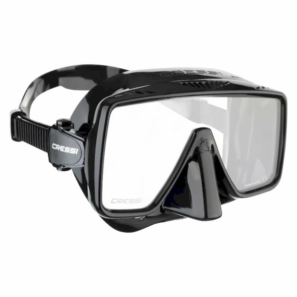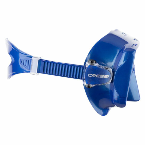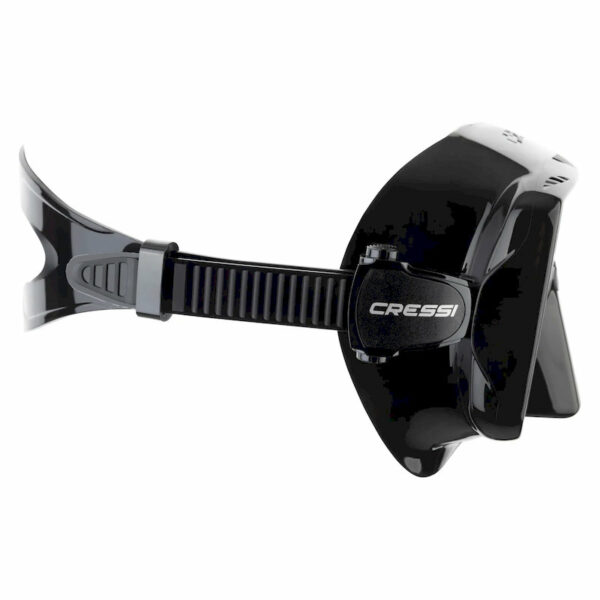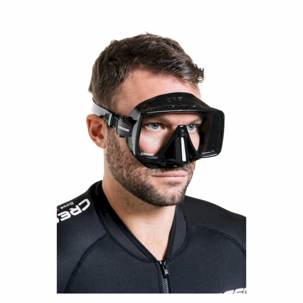 Questa maschera monocristallo senza telaio è fatta in silicone lucido di tendenza e ha un volume molto ridotto. Design rigoroso e squadrato adatto anche ai subacquei esigenti. Si adatta alla maggior parte delle forme del viso. Fibbia con sistema di regolazione micrometrico. Viene fornita con una robusta scatola di protezione.